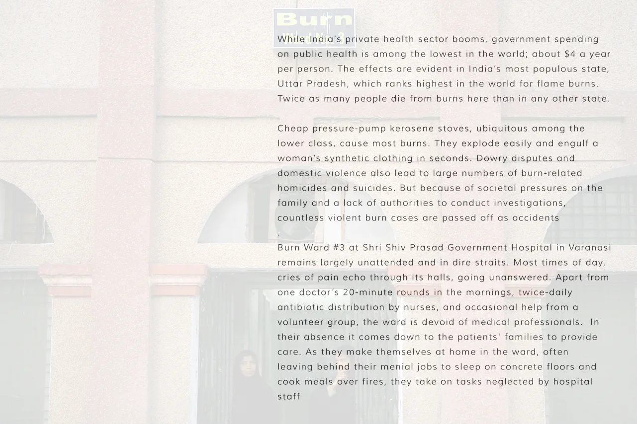While India’s private health sector booms, government spending on public health is among the lowest in the world: roughly four dollars a year per person. The effects are evident in India’s most populous state, Uttar Pradesh, which ranks highest in the world for flame burn injuries. Twice as many people die from burns here than in any other state in the country.